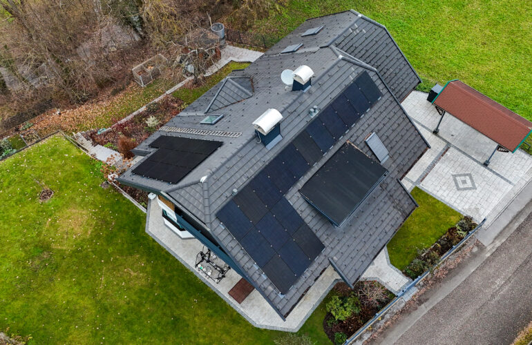 Tonziegeldach mit Dachhaken und verzinkten Metallersatzziegeln als Unterkonstruktion. 10,80kWp mit 16,9kWh Energiespeicher sowie autmoatischer Notstromumschaltung.